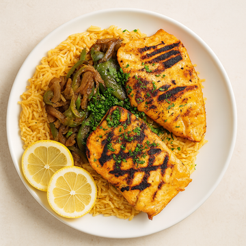 Grilled salmon with rice, bread, sauce, and fresh and your choice of soup or salad and your choice of soup or salad .