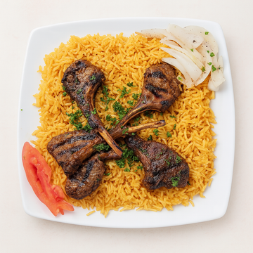 Grilled lamb chops with rice, bread, sauce and your choice of soup or salad .