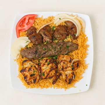 Mix of chicken, beef, kufta with rice, bread and your choice of soup or salad .